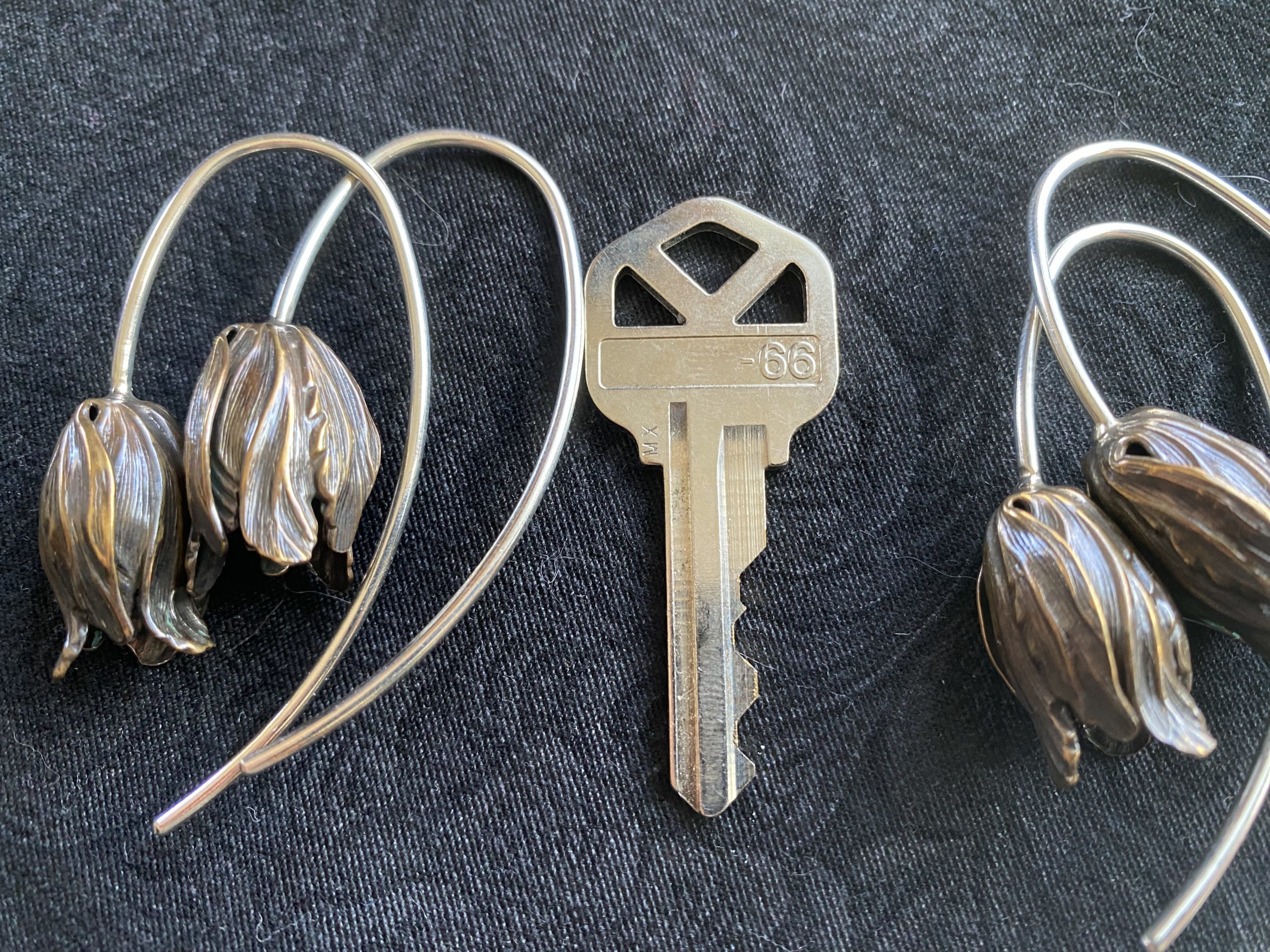 Sterling silver 14g hooks for slightly stretched piercings, brass floral ornamentation w/ darkened patina.